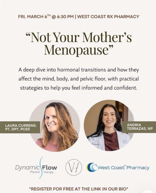 Hormonal transitions can feel confusing, overwhelming, and honestly… a little isolating when no one ever explained what’s happening in your body. This free in-person event is a deep dive into how hormonal changes affect your mind, body, and pelvic floor, plus practical, real-life strategies to help you feel informed, supported, and confident moving forward. Come join Dr Laura, PT, DPT and Andria, NP and owner of Verve Health in Ventura.